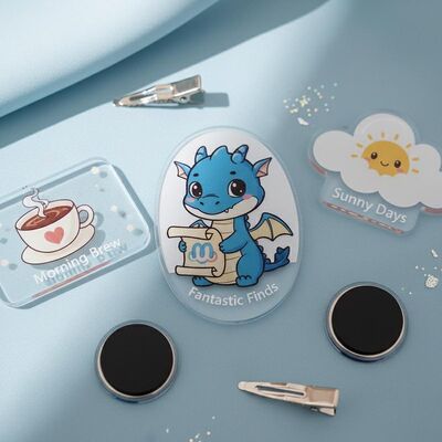 Create personalized acrylic hair pins, button badges, and accessories featuring custom printed logos, cartoon designs, anime characters, or names. These versatile pins feature magnetic backing for secure attachment.